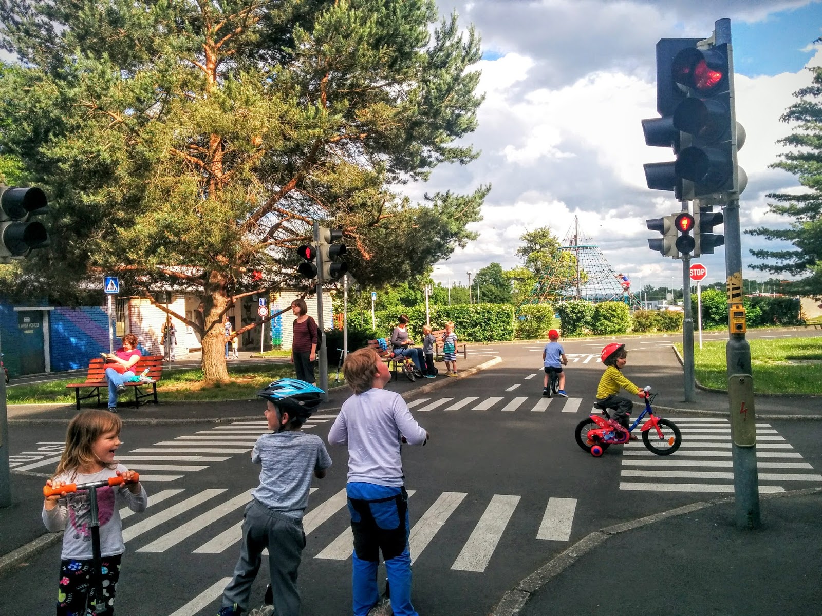 Jag kan visserligen förstå varför de inte finns i Sverige – det finns ju så mycket vägar och så lite folk så man behöver det väl egentligen inte. I Storbritannien däremot skulle en sådan här lekplats vandaliseras med en gång och bli överfull så jag förstår att de inte har dem där heller. Här är det ett slags mittemellan ting. Det finns egentligen inte så mycket folk i Tjeckien (ca 10,5 milj) men väldigt många cyklister. Det ser man på alla som cyklar här och den koncentration av cykel-affärer som finns. Man tar spårvagn nummer 22 till Obora Hvezda för att ta sig till trafik-lekplatsen. Den har öppet för skolor under dagen och från och med kl:16 för allmänheten.