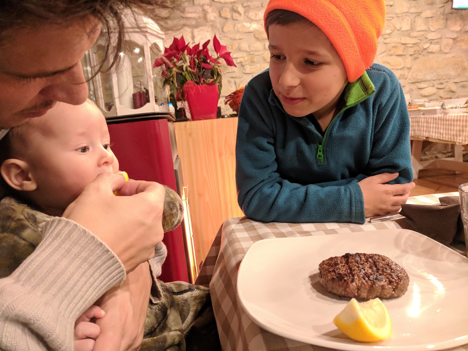 Flygresan dit gick via Bergamo (på grund av billiga flygbiljetter) Vi landade där dagen innan och tänkte att vi lika gärna kunde äta lite pizza och god mat på vägen till Belfast. Vi bokade ett flygplatshotell som inte alls råkade ligga nära flygplatsen som kostade 30 euro att ta sig dit så istället för att betala 30+30 euro för att ta oss in till Bergamo beslöt vi oss för att gå från hotellet och se vad som fanns där på google maps. Hotellet låg alldeles vid motorvägen och en annan stor väg. Vilket hotell-fail! Men vi beslöt oss för att gå på promenad 2.5 km och kom fram till Farm Palasina Noa som var ett Agriturismo. Det är en slags bondgård som vanligtvis är som ett pensionat också men denna hade bara ställplatser för fordon. De skulle öppna vid 19 så vi gick vidare och hamnade på en bensinmacks-bar med högljudda italienare med roliga 80-talsjackor där en hade texten “Im the best”. Det var råkallt och påväg att mörkna. Barnen fick pizza och efteråt gick vi på promenad och såg att det fanns tjurar på gården. Utanför gården fanns det många parkerade lastbilar. När restaurangen öppnade vällde det in massor med lastbilschaufförer och vi. Jag förstod varför de parkerat just där. Maten som serverades var ljuvlig. 15 euros för en sallads -och kak-buffe med en primi piatti (jag tog pasta med räkor och Paul valde risotto) och en secondo piatti (gulasch till mig och en hackbiff till Paul). Edward fick smaka på citron första gången och gillade det.